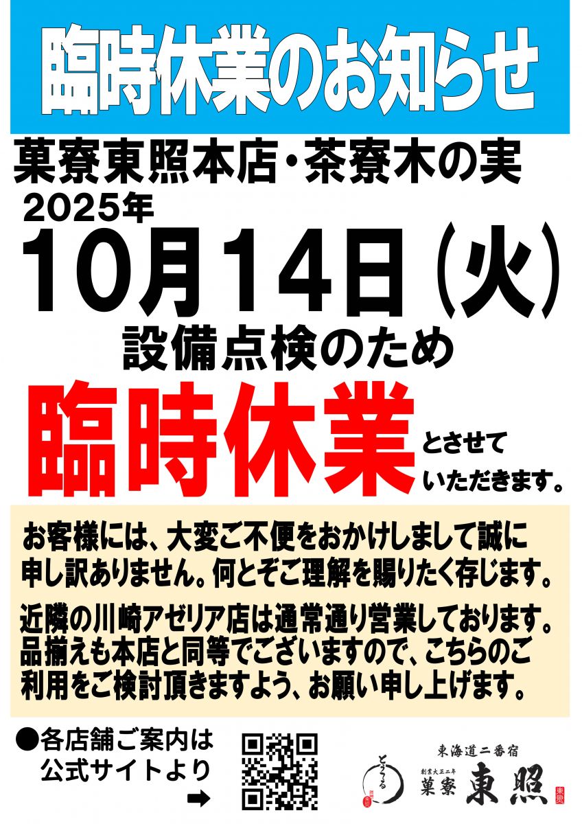 ★2025年10月14日(火)は臨時休業とさせていただきます(設備点検のため)。